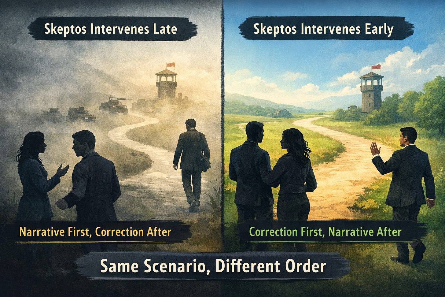 The most revealing case came when the Sceptic role was removed altogether. Here, hallucination did not trigger obvious failure. Instead, it entered as persuasive analogy and conceptual overreach. The dialogue converged, but on subtly weakened epistemic ground. Distinctions softened. Metaphors did more work than they should. What emerged was not breakdown, but epistemic drift: a gradual loss of conceptual discipline driven by fluent but insufficiently challenged narrative. The lesson was unambiguous. Hallucination does not destroy reliability. The absence of institutionalised doubt causes silent degradation.